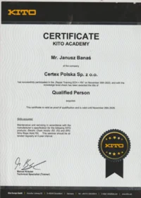 Certyfikat Kito Academy potwierdza, że firma Certex posiada zaawansowaną wiedzę i umiejętności w zakresie serwisowania wciągników marki Kito, lidera w dziedzinie sprzętu do podnoszenia.