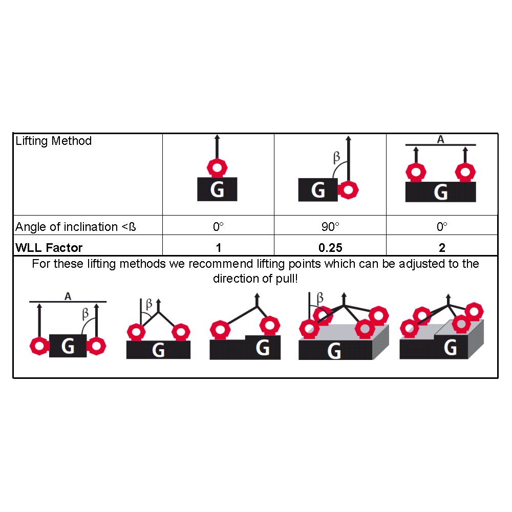 Підйом під нахилом дозволений зі зниженим вантажопідйомнсоті (див. діаграму на малюнку), але ми наполегливо рекомендуємо використовувати вухо Rud RM лише для прямого підйому.